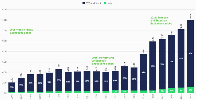 מאז 2020, היקף המסחר באופציות עלה מ-5 מיליארד חוזים בשנה ליותר מ-14 מיליארד (!) הצפויים בשנת 2025 – צמיחה של כמעט פי שלושה בתוך חמש שנים. במספרים יומיים, מדובר בקפיצה מ-20 מיליון עסקאות ליותר מ-60 מיליון בממוצע ליום.