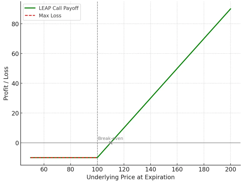 כמו כל אופציה, גם LEAPS נותנות לבעל האופציה זכות (ולא חובה) לקנות (Call) או למכור (Put) את המניה או מדד מסוים במחיר קבוע (Strike) עד או במועד הפקיעה.