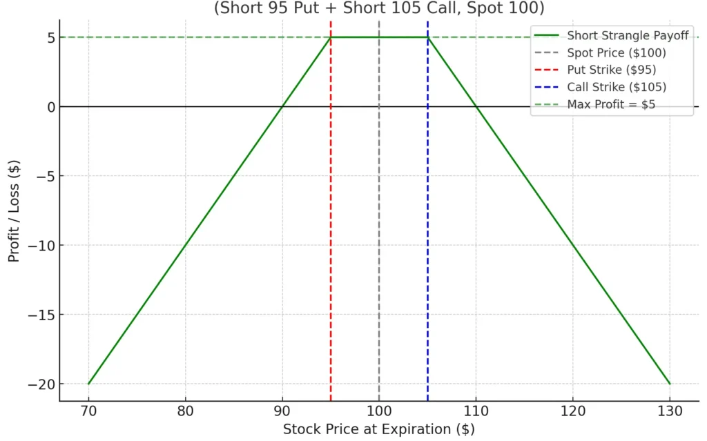 - רווח מקסימלי – הפרמיה שנקבלה מראש. במקרה שהמניה תישאר בין שני מחירי המימוש (בין 95$ ל־105$ בדוגמה שלנו), שתי האופציות יפוגו חסרות ערך, והמשקיע ישמור את כל הסכום שקיבל.