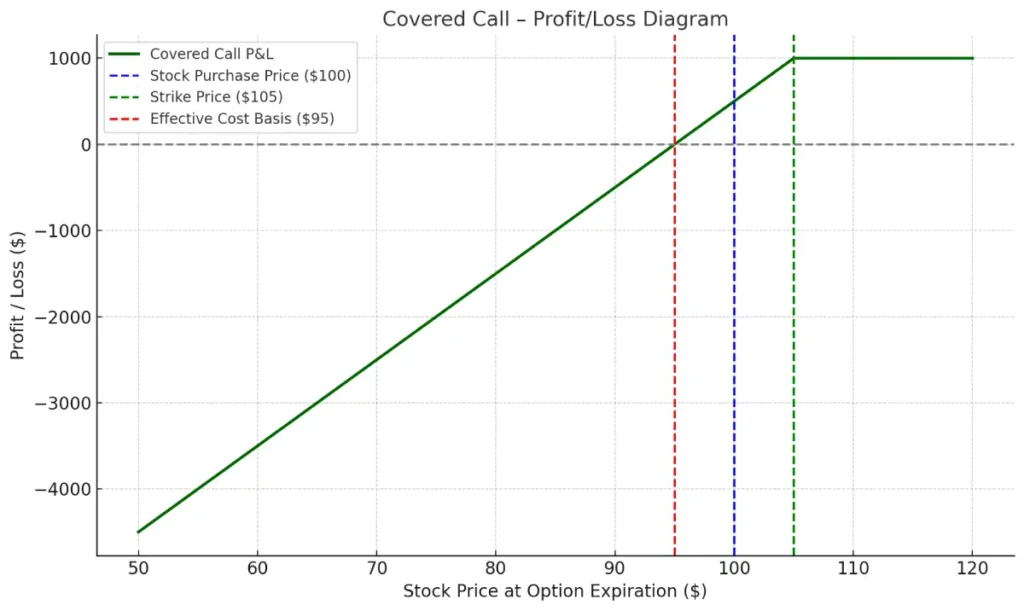 אם מחיר המניה ירד מתחת לסכום זה – ההפסד גדל ככל שמחיר המניה יורד (עד לרמה אפסית). אם מחיר המניה יעלה מעל 105 דולר עד לפקיעת האופציה – האופציה תמומש, והמניה תימכר במחיר המימוש. הרווח המרבי יהיה 1,000 דולר לאופציה אחת – 500 דולר מעליית ערך המניה ו-500 דולר מהפרמיה.