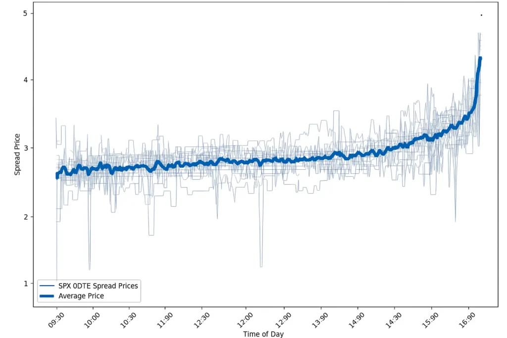 ביום מסחר תנודתי במיוחד, מרווחים של 0DTE התנהגו באופן חריג: המרווחים שמרו על ערכם זמן רב יותר מהרגיל, והפער בין מחיר הביקוש למחיר ההיצע התרחב משמעותית. זהו תזכורת לכך שבימי תנודתיות גבוהה, גם כללי דעיכת הזמן הרגילים עלולים להשתבש.