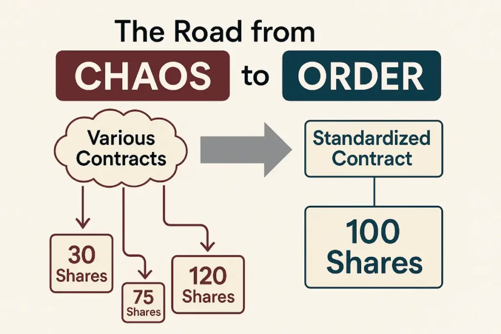 כך היה גם בשוק ההון לפני עשרות שנים, עד שבשנות ה־70, עם הקמת ה־CBOE (בורסת האופציות של שיקגו), הוחלט לקבוע כלל פשוט וברור: חוזה אופציות אחד מייצג חבילה של 100 מניות. ההחלטה הזו שינתה את פני השוק והפכה אותו למה שאנחנו מכירים היום – מסודר, נגיש וקל למסחר.
