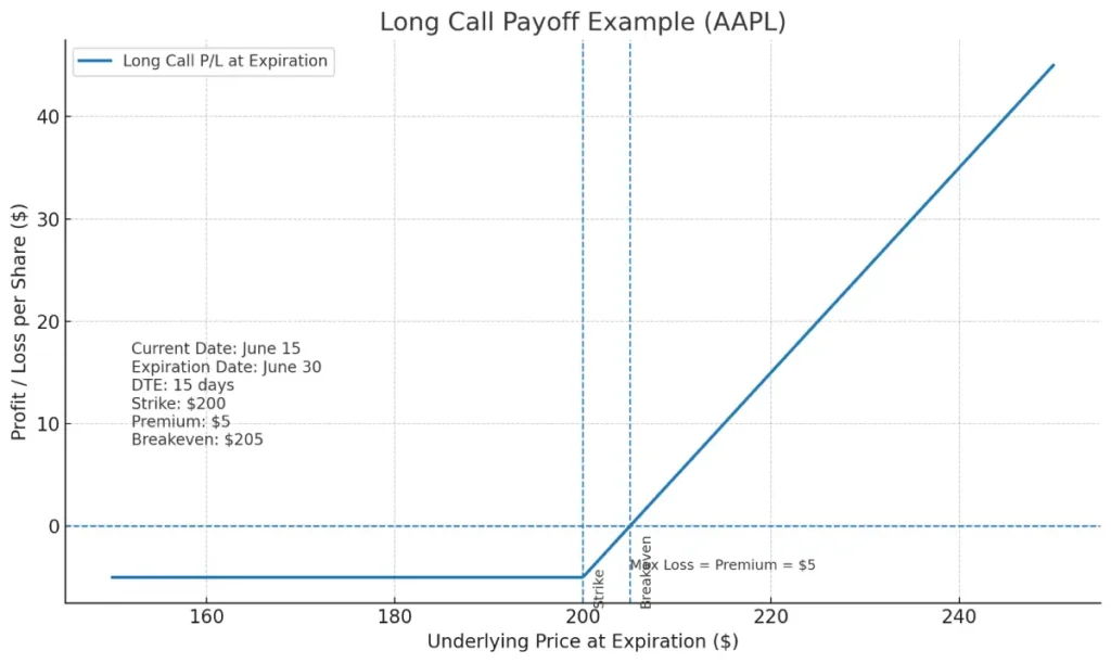 נניח שאתה קונה אופציית Call על מניית Apple (AAPL) במחיר מימוש (Strike) של 200 דולר, שתפוג ב־30 ביוני. היום הוא 15 ביוני, והמניה נסחרת בדיוק ב־200 דולר. על האופציה הזו אתה משלם פרמיה של 5 דולר.