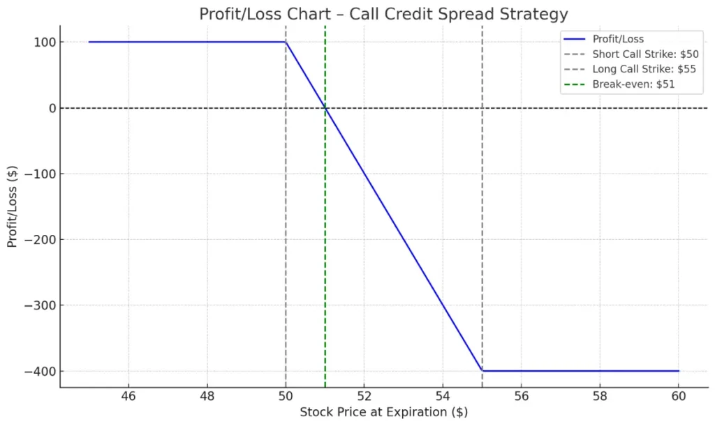 גרף הרווח/הפסד של Call Credit Spread מציג בצורה ברורה את תחום הרווח והסיכון המוגדרים של האסטרטגיה. הקרדיט שהתקבל בעת פתיחת הפוזיציה הוא הרווח המקסימלי. מכיוון שאופציה ארוכה נרכשת כהגנה, ההפסד המקסימלי מוגבל לפער בין המחירים פחות הקרדיט.
